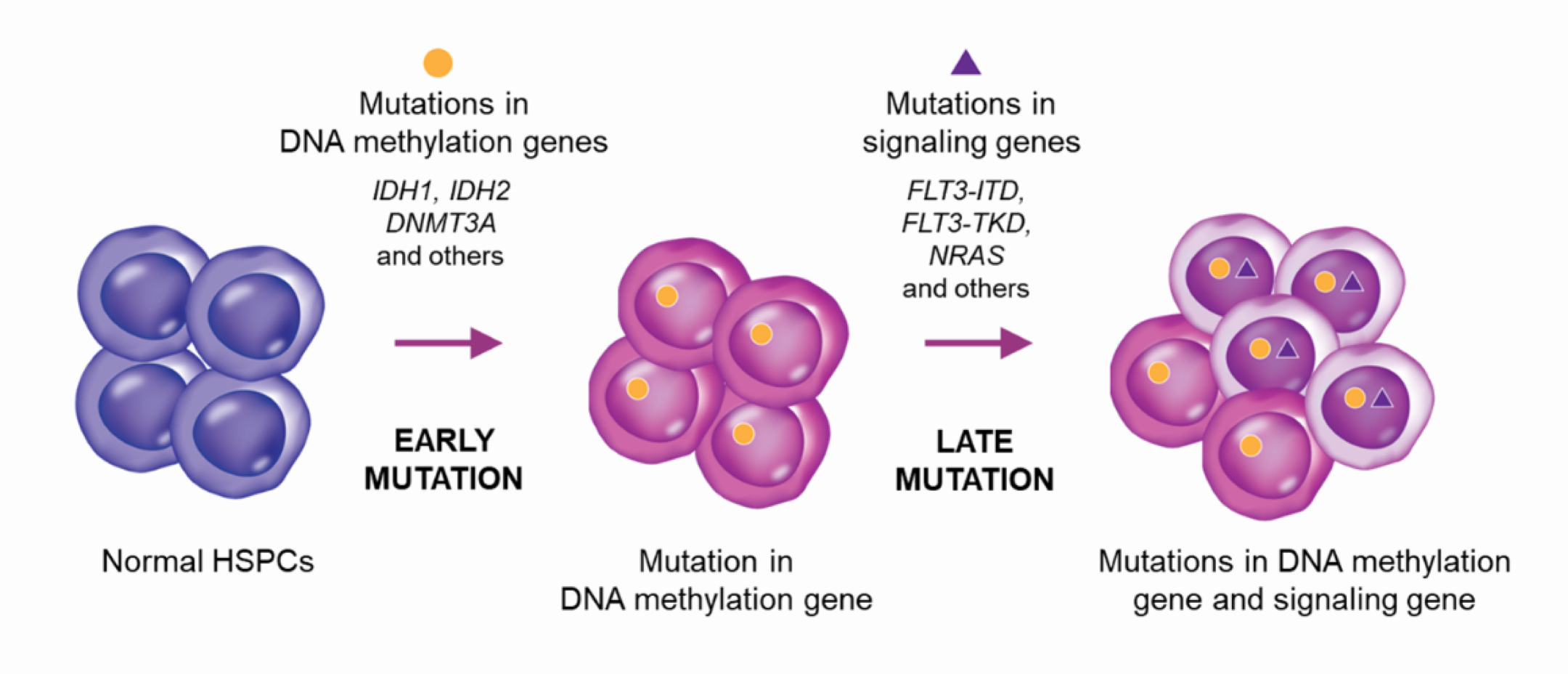 Genetically, AML progression entails successive accumulation of mutations, which tend to occur in a specific order with respect to biological pathways.23-26 Mutations in DNA methylation and other epigenetic genes (e.g., DNMT3A, IDH1/2) tend to occur early, while mutations in signaling genes (e.g., FLT3, NRAS) generally occur later.23-26 Analysis of clonal evolution in AML has revealed that early mutations in DNA methylation/epigenetic genes, including mIDH1 and mIDH2, are typically present in the main clone, while subsequent mutations, such as those in signaling pathway genes (e.g. FLT3 and NRAS), often emerge as secondary clones.25, 26