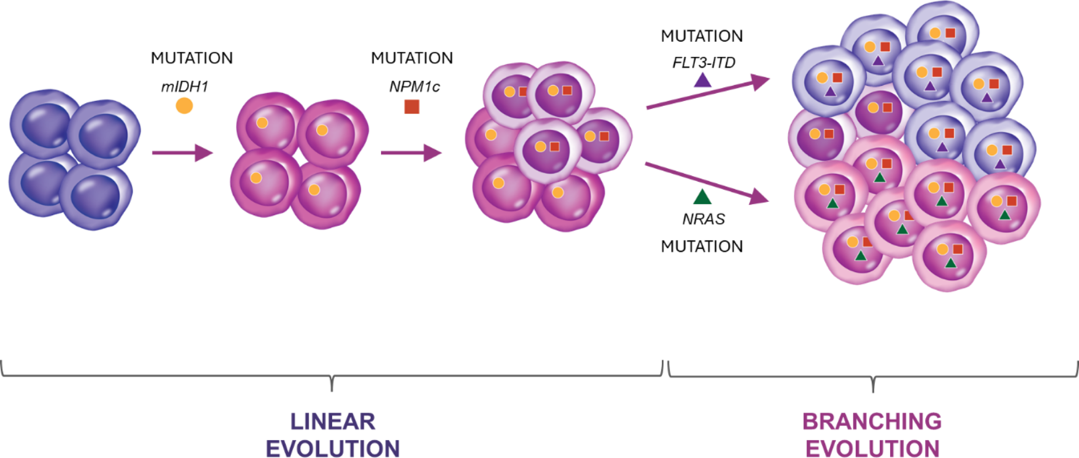 Example of clonal evolution of mIDH1 AML, with mIDH1 representing the main clone, and the subsequent emergence of an NPM1-containing clone through linear evolution followed by emergence of FLT3 and NRAS secondary clones through branching evolution. Since mIDH1 is present in the main clone, it is present in all descendant cells in the NPM1, FLT3-ITD, and NRAS-secondary clones.26